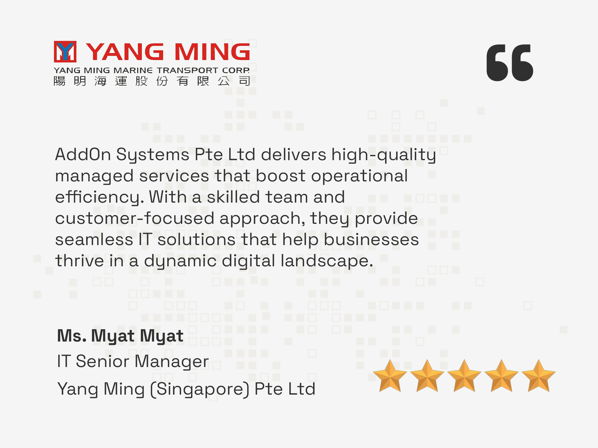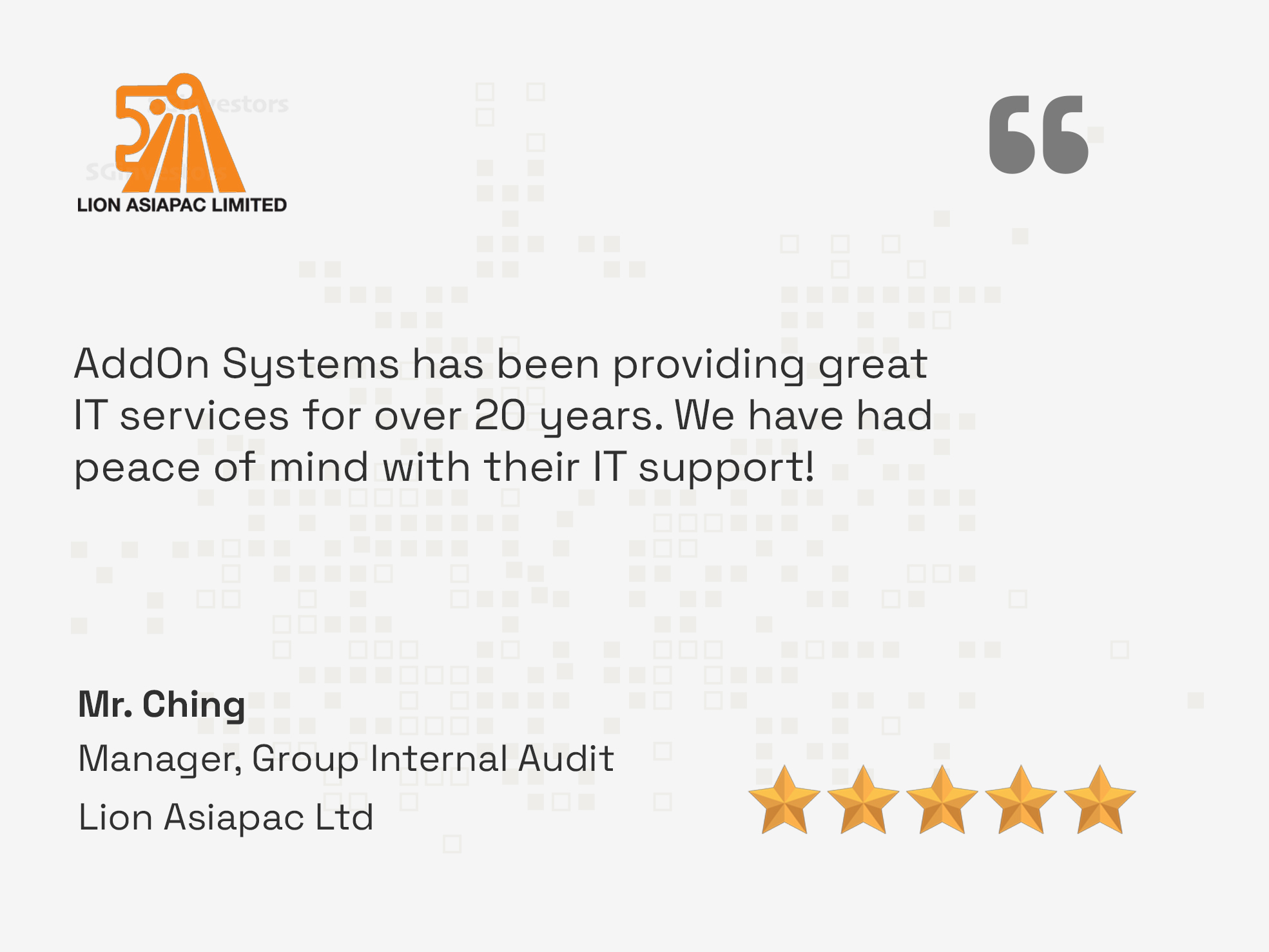 Founded in 1992, AddOn Systems Pte Ltd is a distinguished IT solutions provider dedicated to delivering comprehensive and cutting-edge services to our valued clients. With a proven track record as an industry leader, we have earned a reputation for excellence and innovation.